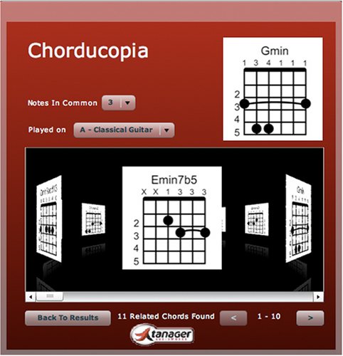 Chorducopia is like the PC or Mac version of that trusty tattered chordbook in your guitar case, only better. When you are writing and you have that perfect sound in your head, but cant quite translate it to your fingers, Chorducopia can help. With over nine-hundred chords hand-diagrammed and recorded in every key, Chorducopia offers the songwriter or student access to the essential elements of songwriting. Browse through chords, filter them by key or a variety of other methods, or search for just the one you are looking for, then listen to them. Chorducopia can show you chords related to what you have found for that extra bit of inspiration. Care has been taken with every chord, in every key to provide the most useful and accurate representation. And it sounds great too. We have put great attention to detail into the recording of every chord. We offer chord voicings made up from both the notes contained in the chord formula as well as the actual fingered notes as shown in the fretboard diagrams. All recording was done using state-of-the-art equipment and the results can be heard. Instrument, cabinet, reverb, attack and spread of individual notes in the chord have all been carefully selected for the clearest and most useful representation. We want to make our tools not only the easiest to use, but ones that exemplify their greatest asset. You. Get the idea out of your head and into your song. Product Specifications - Runs on Windows XP/Vista PC's and PPC/Intel Macs. Contains 990 chord sounds (55 in each enharmonic key name.). Chord Sound library contains 2 banks of 3 instrument sounds each (almost 6000 files.)Bank A - Fretboard Diagram Voicings includes Clean Strat, Classical Guitar and Rock Guitar sounds. Bank B - Chord Formula Voicing Over 2 Octaves includes Acoustic Guitar, Rhodes Piano and Grand Piano sounds. Chord sounds are individual audio clips - plays on any computer with any sound card setup.
